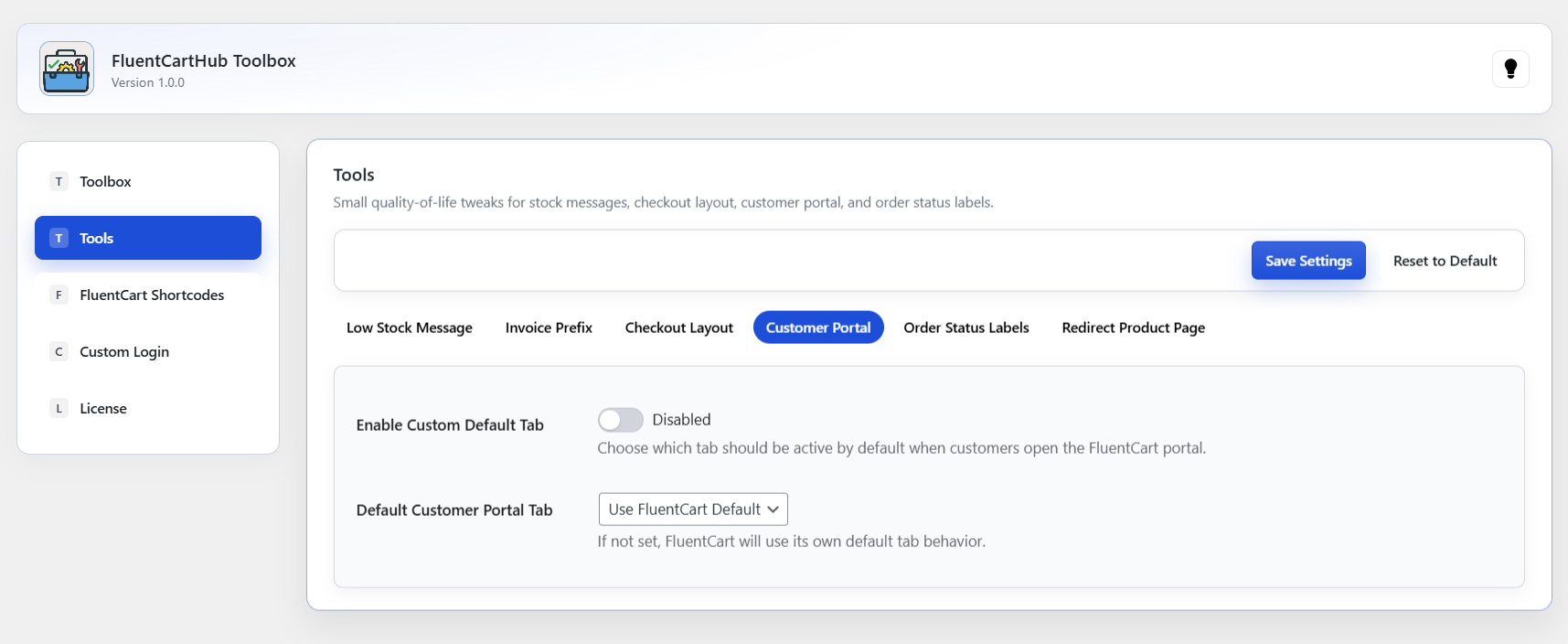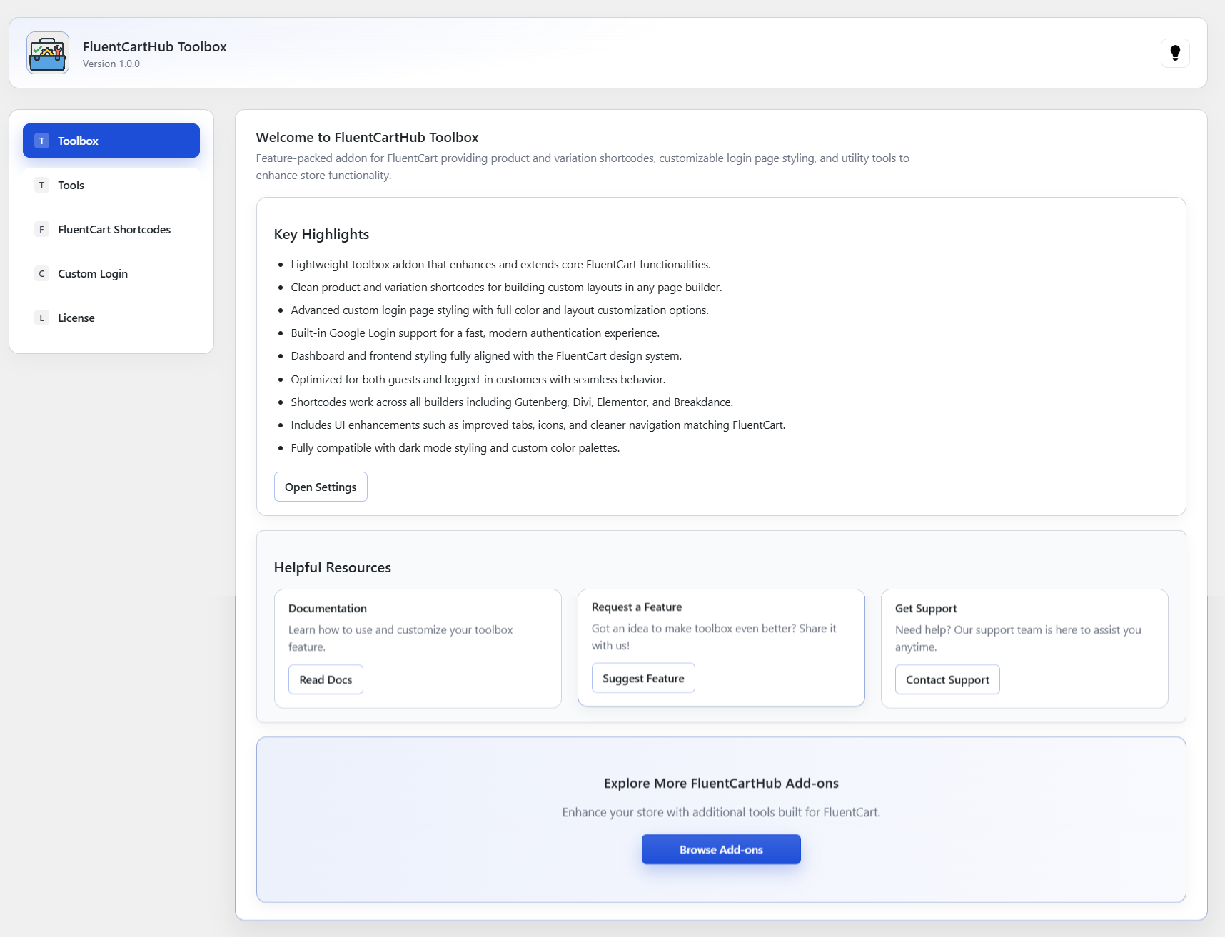The welcome dashboard provides a clear, friendly introduction to the Toolbox add-on. It highlights the key features, offers quick access to documentation, lets you submit feature requests, and provides direct links to support. From here, you can jump straight into the advanced settings and explore all available tools. The layout is intentionally simple, organized, and easy to navigate, helping you understand the add-on at a glance and start customizing your FluentCart store immediately.
