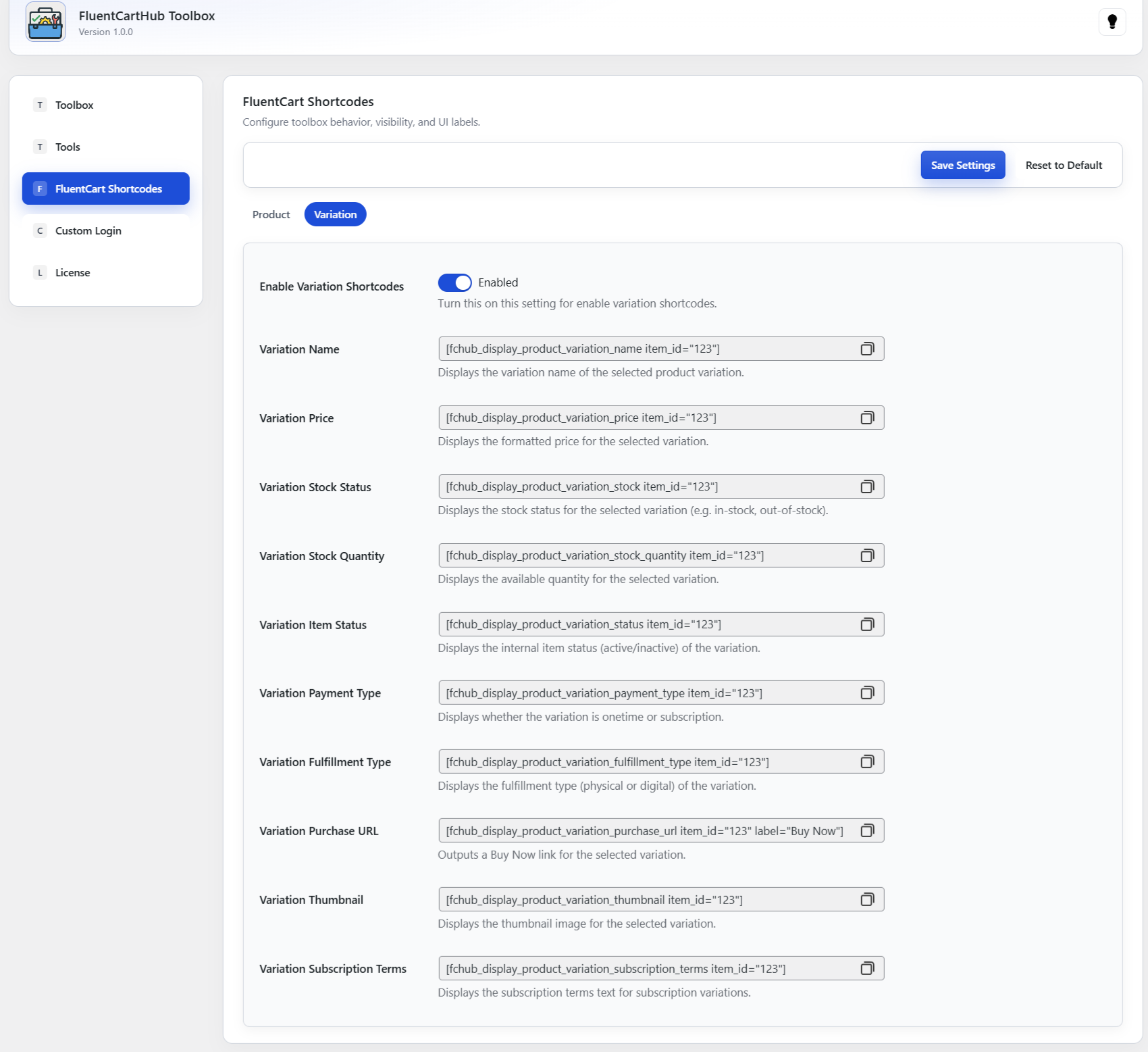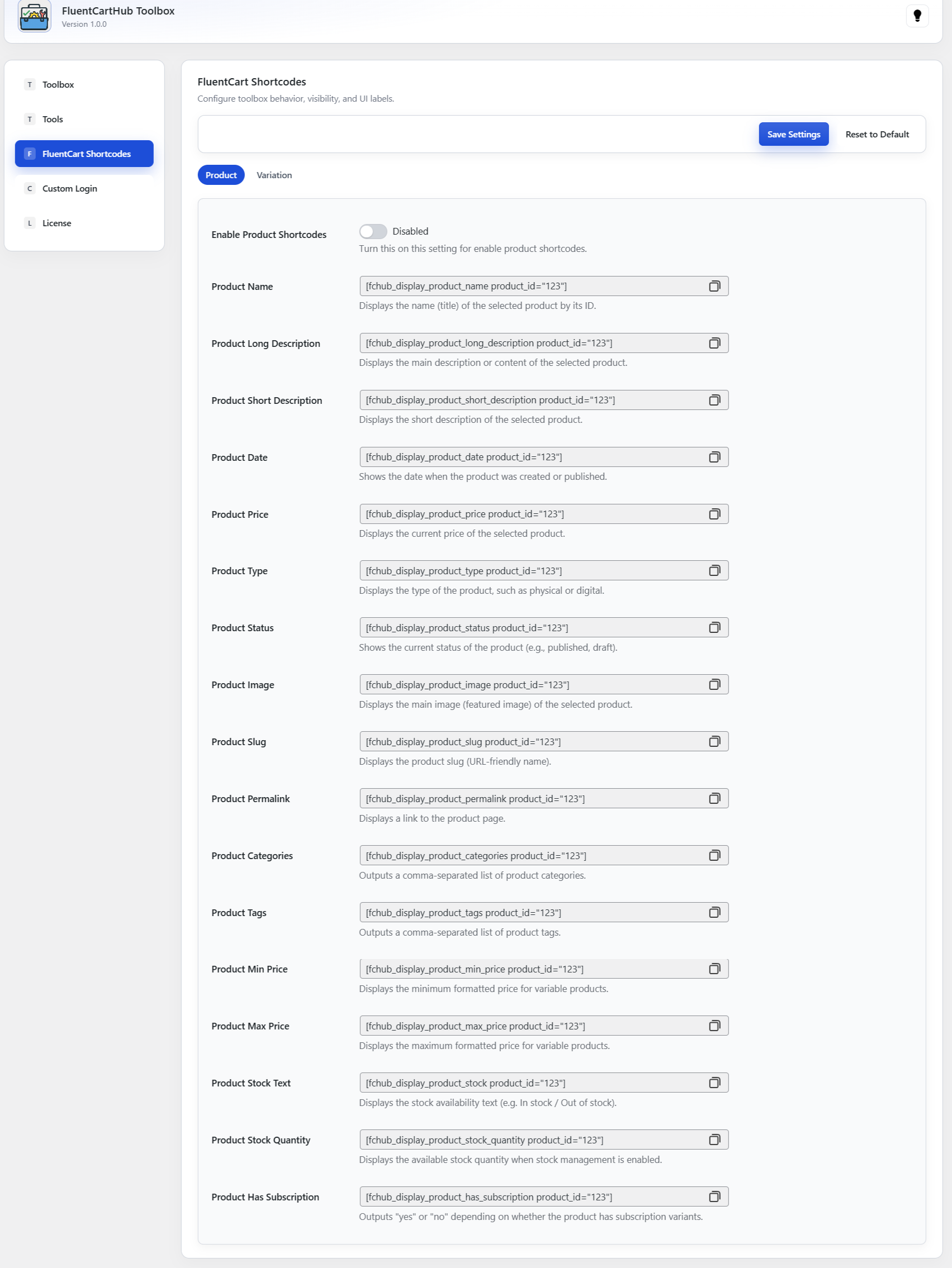Configure toolbox shortcode behavior, visibility, and UI labels for FluentCart products and their variations.