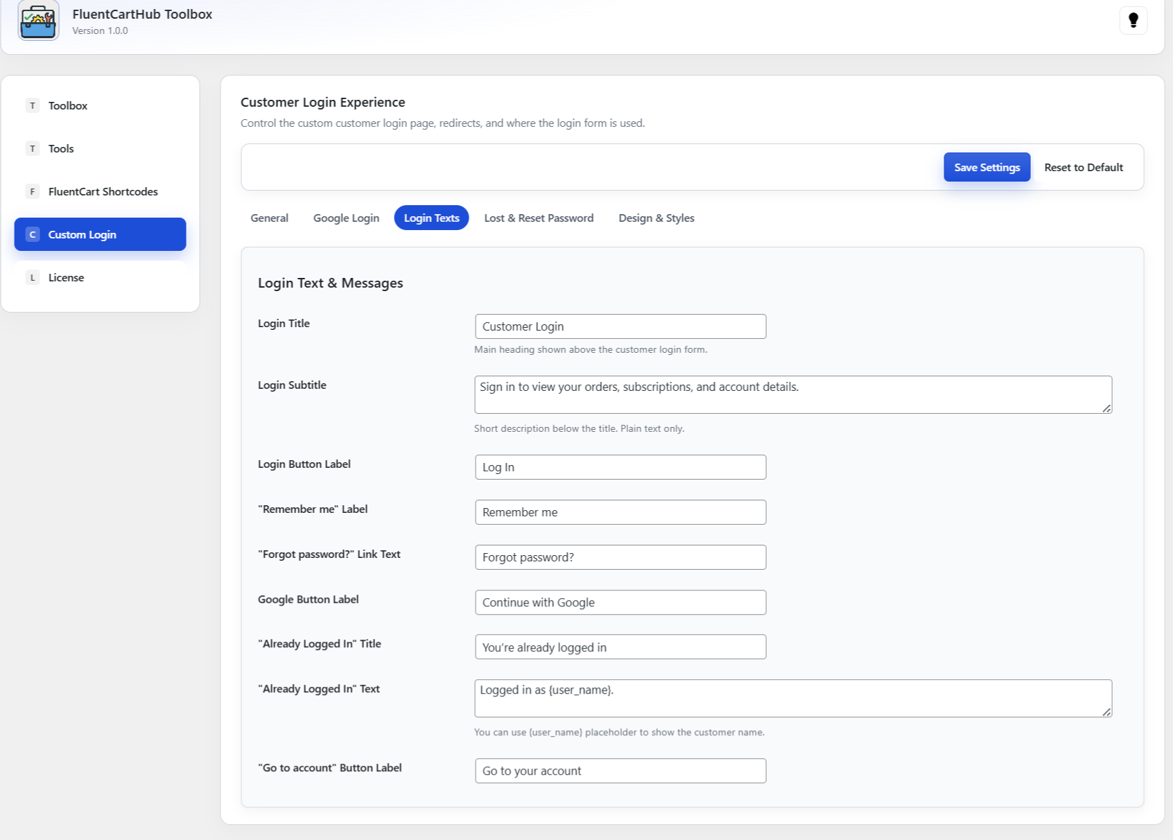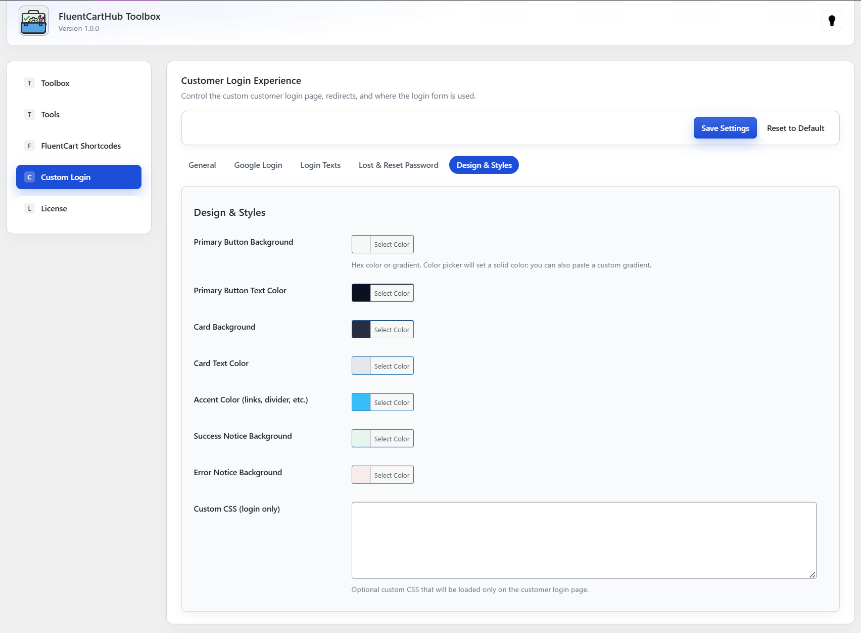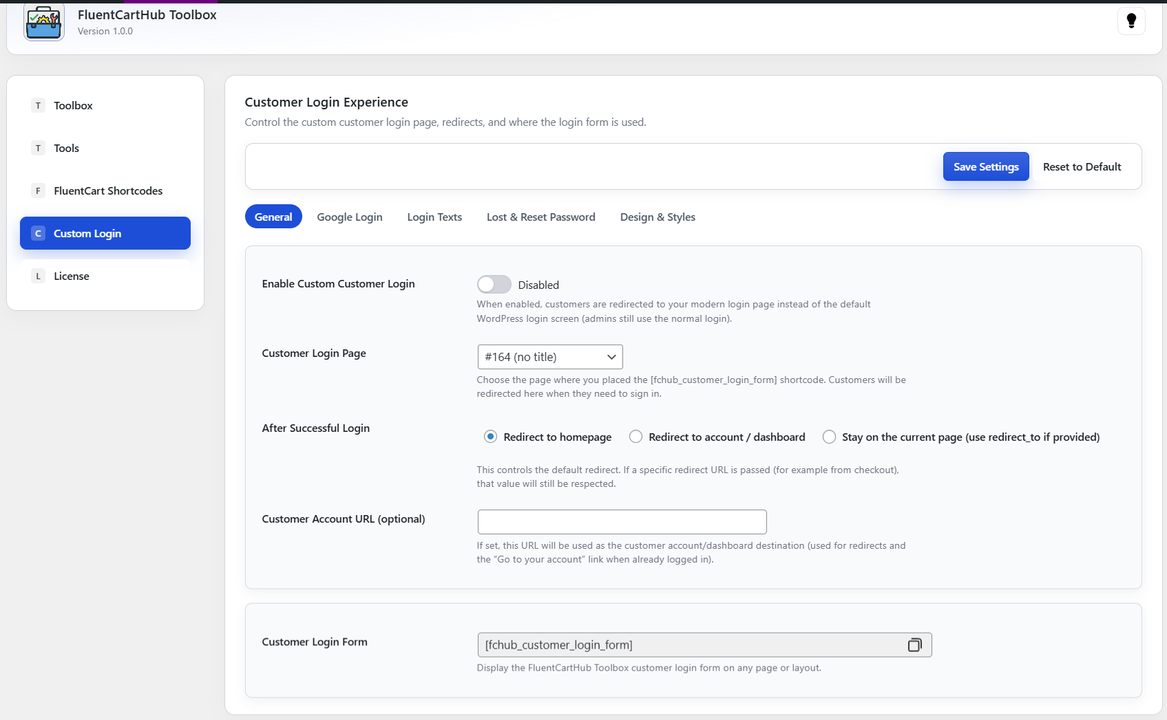 Replace the default WordPress login with a modern, FluentCart-styled customer login page. Control where the login form appears, what happens after login, and how the entire experience looks and feels – all from one clean settings panel.