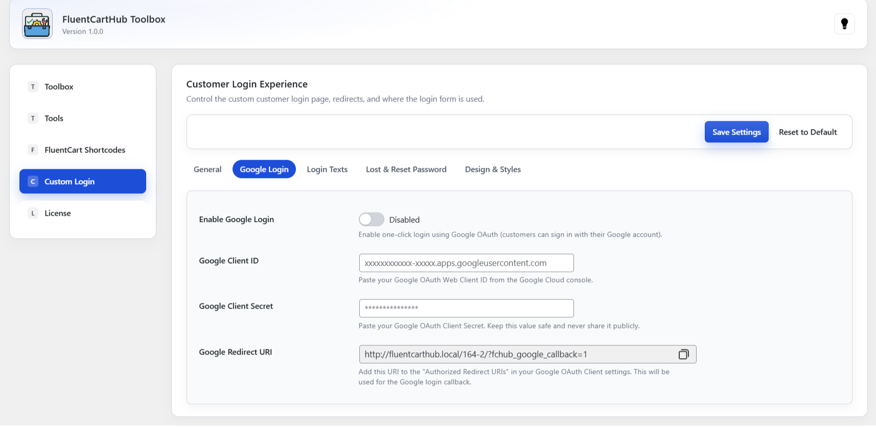 Offer customers a faster way to sign in using their Google account. Simply paste your Google OAuth Client ID and Secret, and Toolbox handles the rest – including the redirect URL and callbacks.